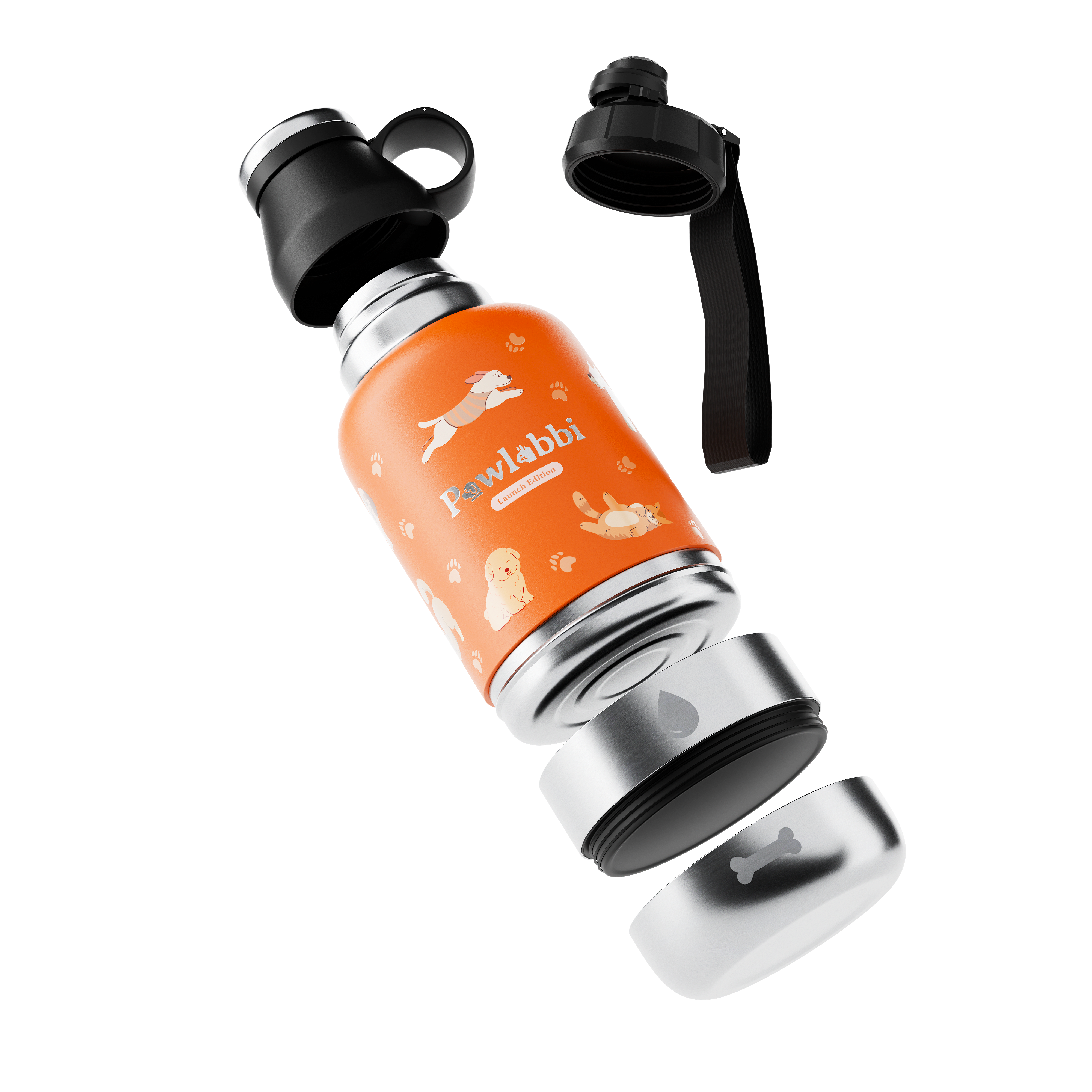 Pawbottle Thermo Trinkflasche für Haustiere Hunde & Katzen mit 2 Näpfen (960 ml + 2×100 ml) | Orange